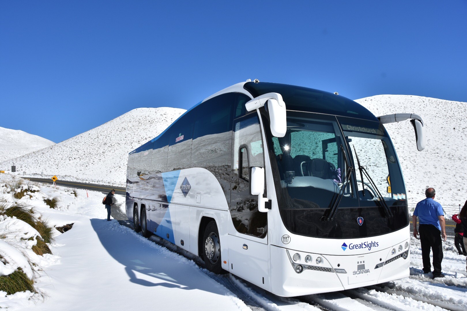 大型バスでクイーンズタウンを出発し、地元のドライバーガイドの解説を楽しみながら北上します。険しいカワラウ川峡谷(Kawarau River Gorge)の歴史的な金鉱地帯や、有名なフルーツ産地クロムウェル(Cromwell)を通過。ダンスタン湖(Lake Dunstan)の湖畔を横切り、リンディス峠(Lindis Pass)を越えて、オマラマ(Omarama)で途中休憩します。